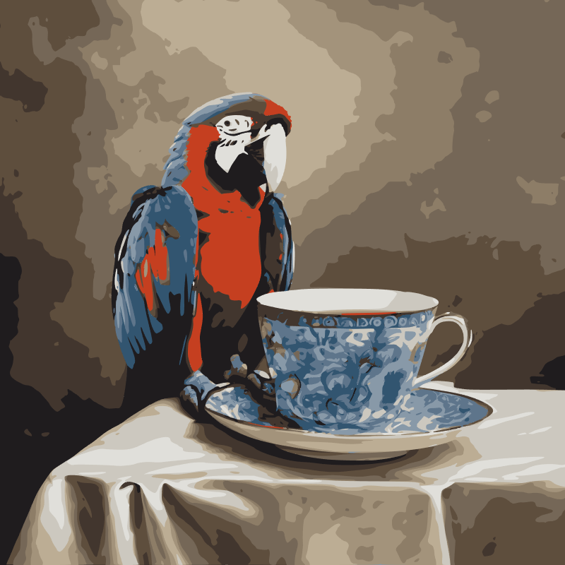 The "Birds and Tea Cups" series is a bold and striking exploration of power, precision, and the juxtaposition of the majestic with the delicate. Each artwork showcases the commanding presence of birds paired with the intricate refinement of tea cups, creating a visual narrative that bridges strength and fragility.