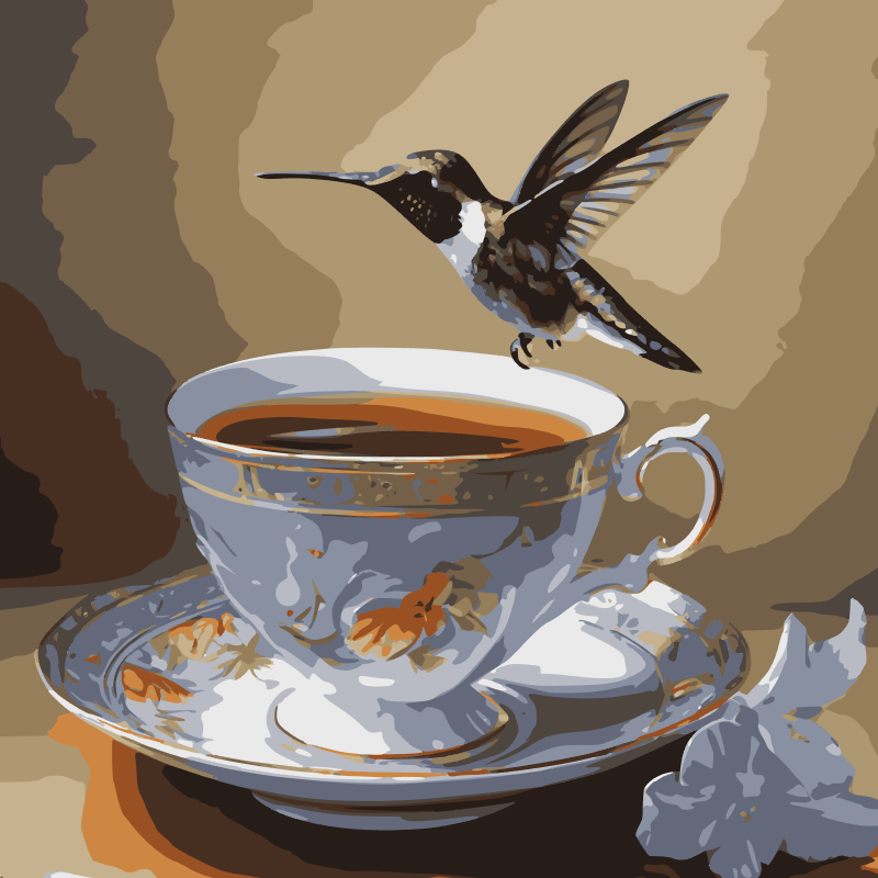 The series depicts dynamic scenarios where birds perch confidently on tea cups. These compositions, brought to life with vivid details and dramatic contrasts, capture a sense of awe and equilibrium.