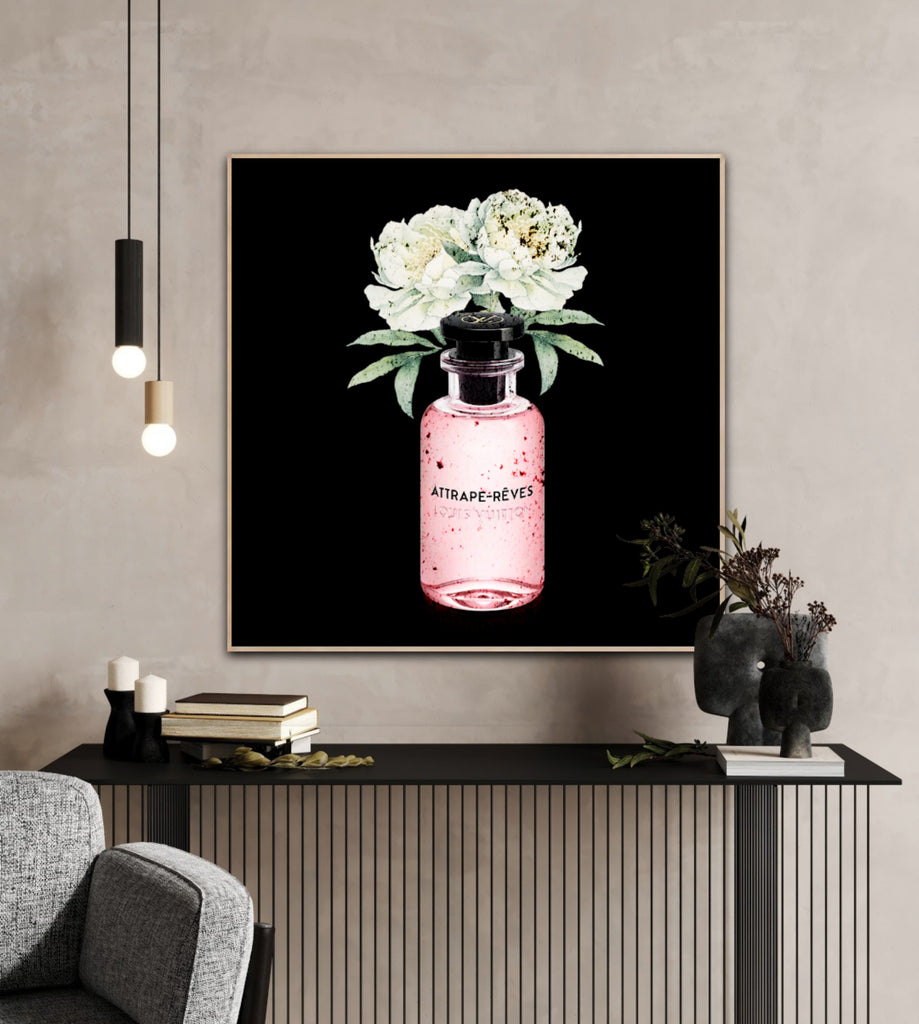 Celebrate the spirit of luxury and elegance with the Louis Vuitton Perfume Series, a stunning collection of fine art prints that blend fashion and florals in timeless harmony. Each piece features the iconic Louis Vuitton perfume bottles, beautifully paired with expressive floral arrangements.