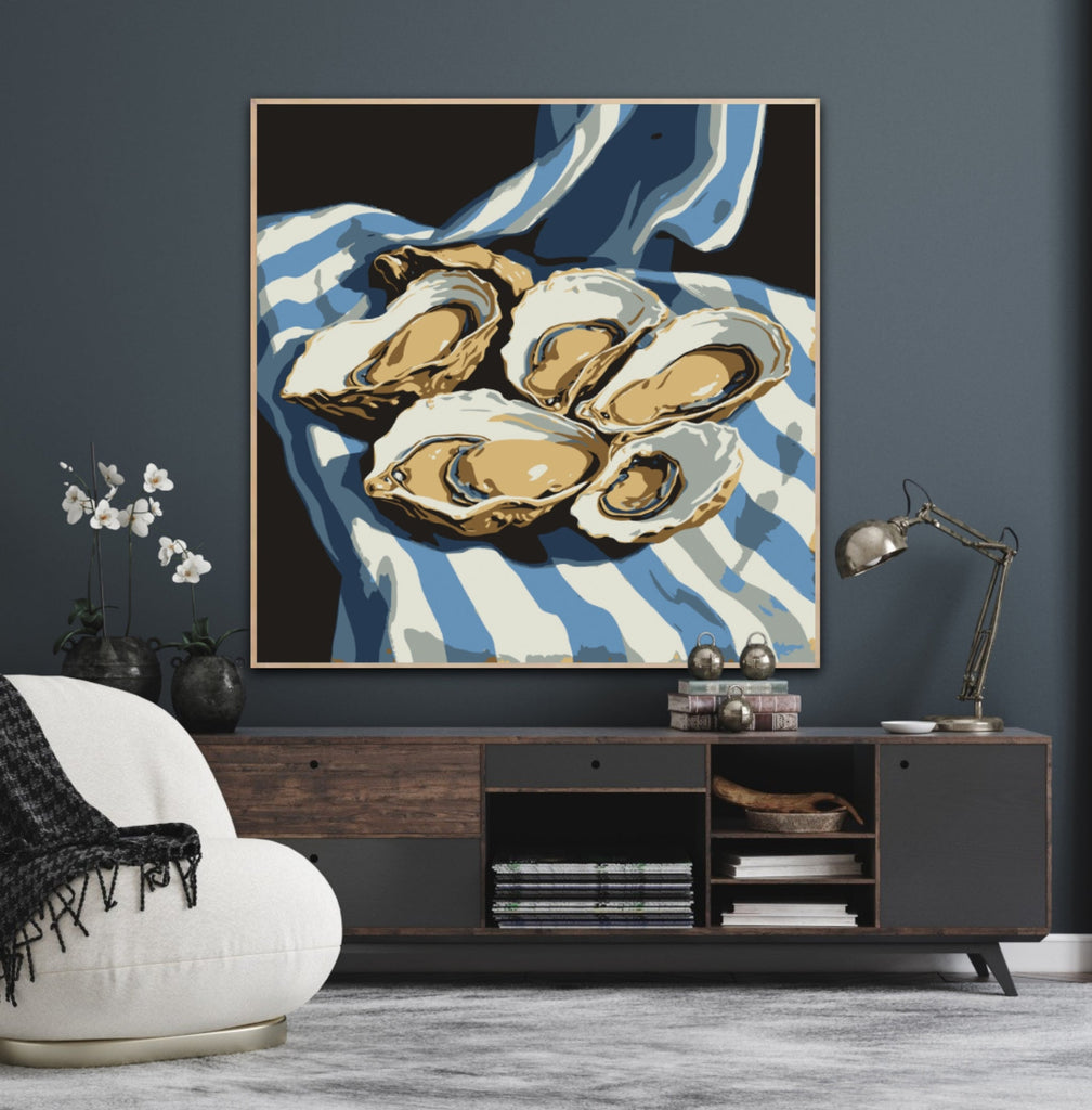 Celebrate coastal elegance with Oysters on Striped – a striking artwork that captures the natural beauty of oysters set against bold, contemporary stripes. First envisioned and designed digitally, each piece is brought to life by hand when ordered, transforming your chosen size into a bespoke original artwork.